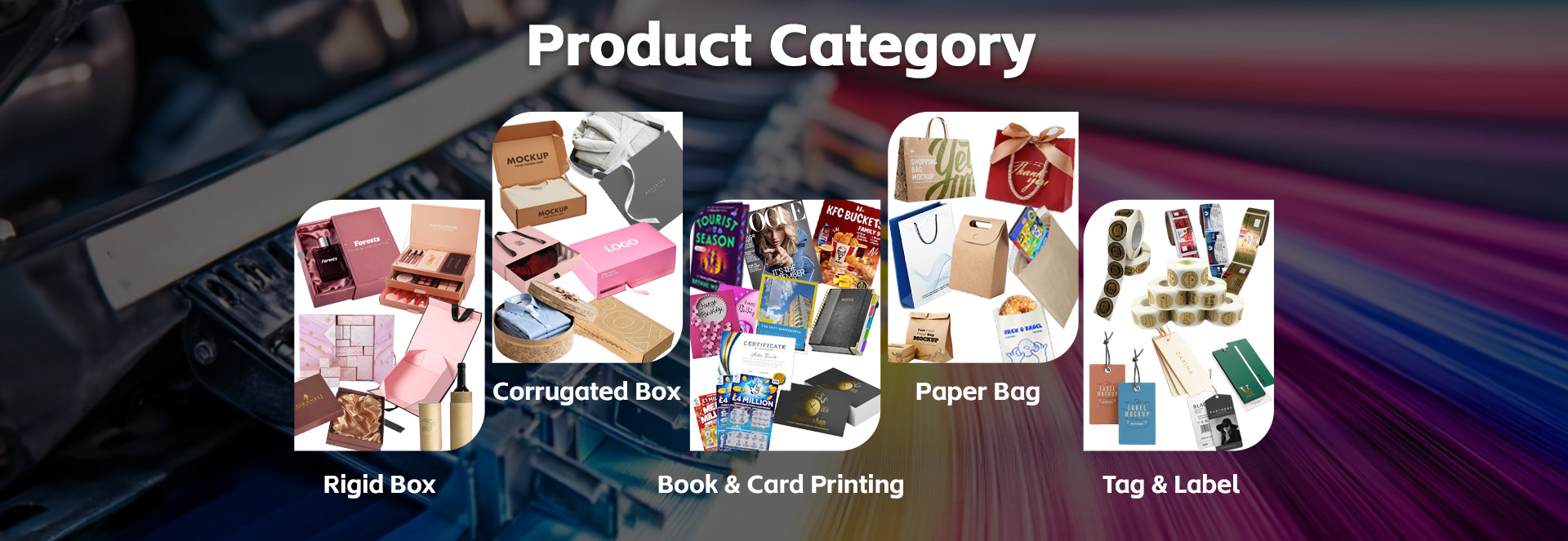 2、Main Products: Rigid Gift Box, Corrugated Shipping Box, Shopping Bag, Book & Card Printing, Tag & Label